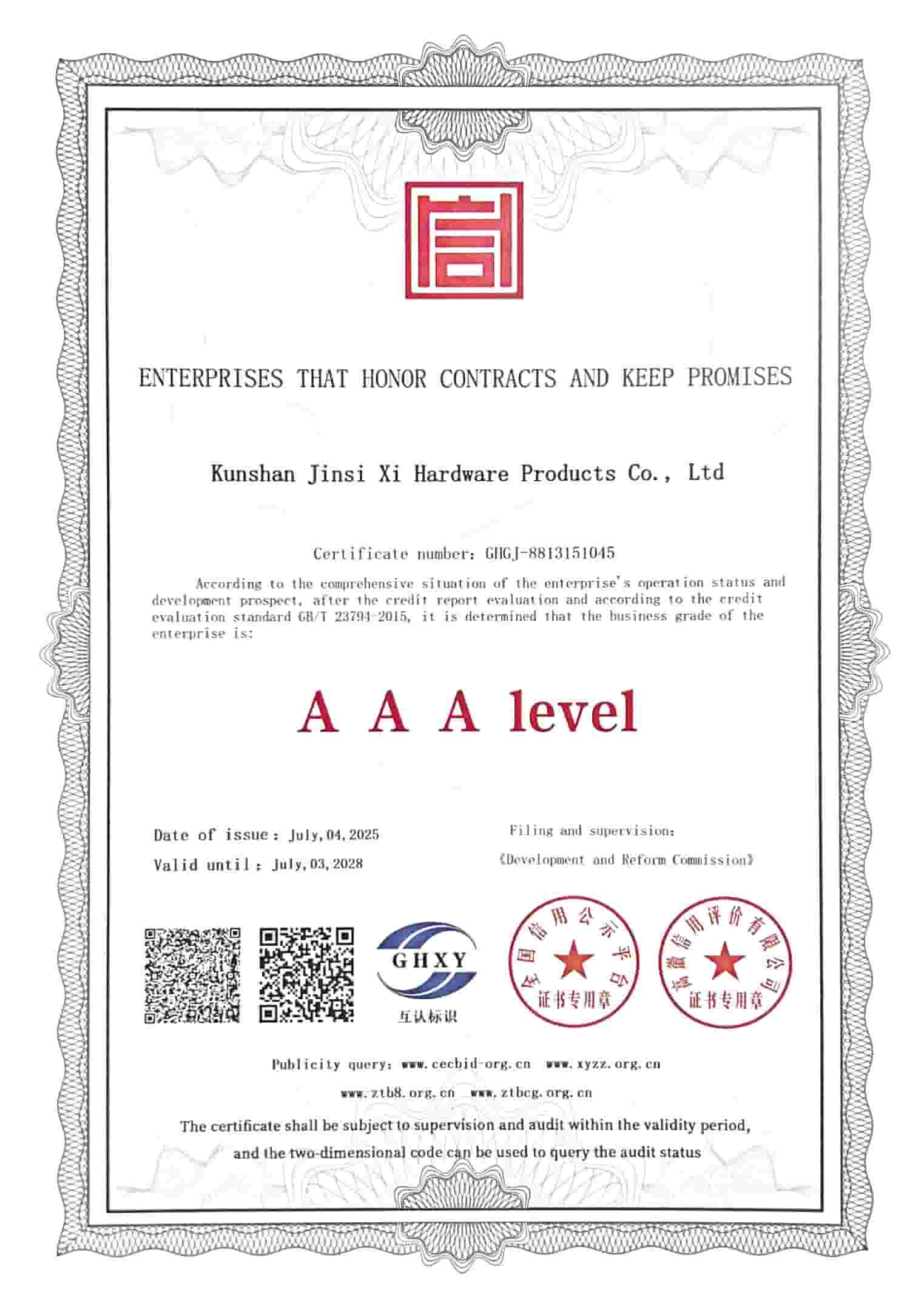 KunshanJINSIXIMetalware Co., Ltd. ha ricevuto ufficialmente il titolo di "Imprese di livello AAA che onorano i contratti e mantengono le promesse". JINSIXI ha sempre aderito alla filosofia aziendale di "unità e cooperazione, diligenza, ricerca dell'eccellenza e perfezione", operando con integrità, fornendo ai clienti servizi di alta qualità e, infine, ottenendo il "perfetto adempimento".